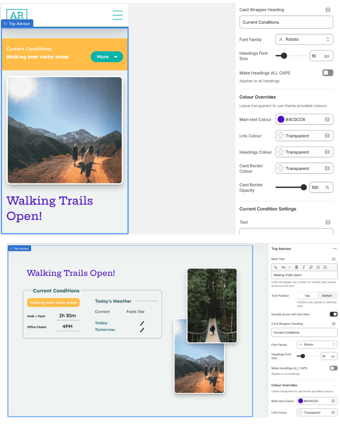 Built extensive Shopify theme customizer integration allowing complete visual and functional control without code changes. The system supports custom color schemes, typography controls, business hour management, and condition override capabilities. Combined with the technical consultation on booking systems, the weather advisor became the primary customer decision-making tool still active on the live site.