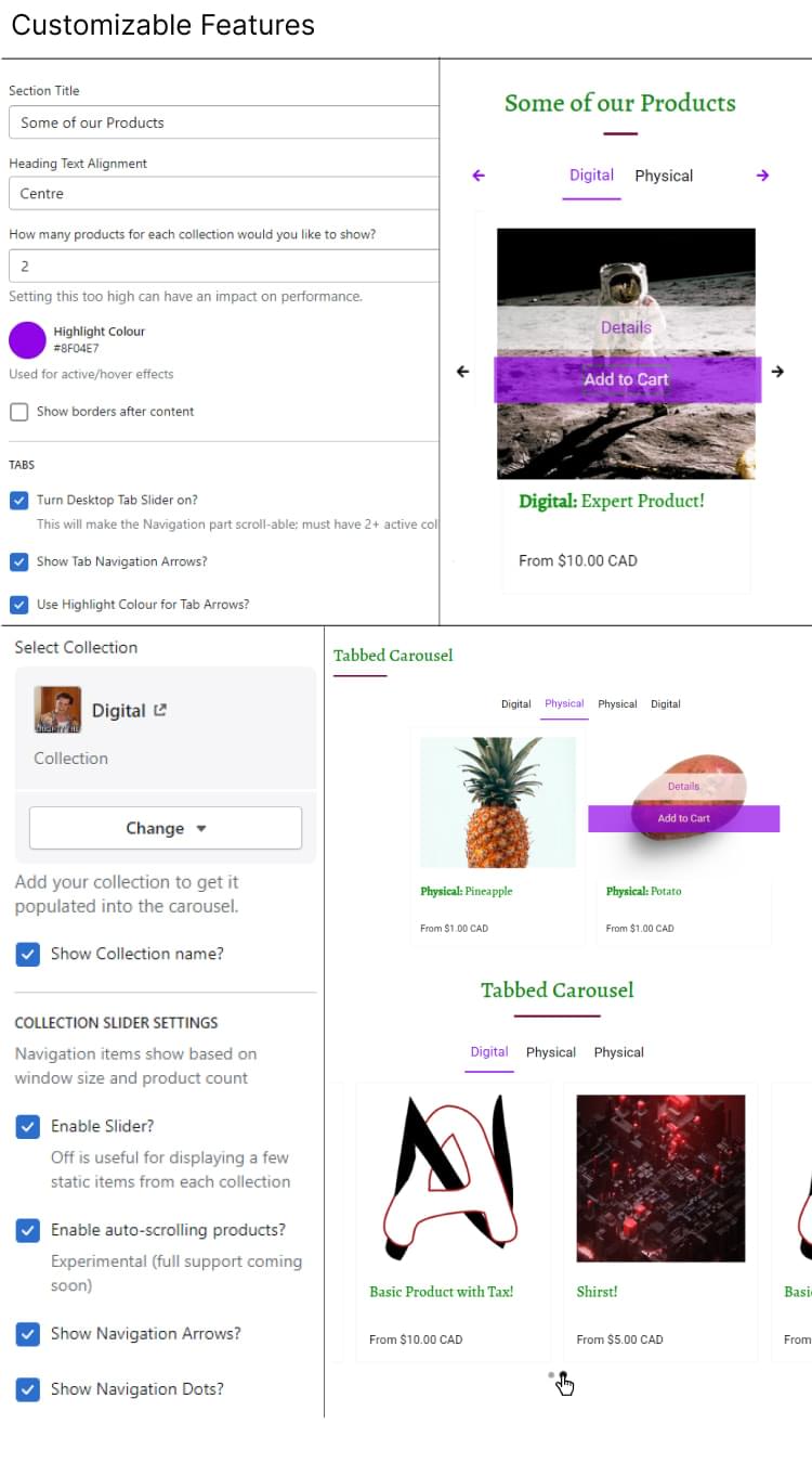 Versatile carousel plugin designed for e-commerce product display, featuring tabbed navigation to organize large product collections into manageable categories. Originally developed as a WordPress plugin for WooCommerce integration, the solution demonstrated remarkable adaptability when later evolved into a custom Shopify theme component during client platform migration. This cross-platform development approach showcased technical flexibility and the ability to maintain consistent functionality while adapting to different e-commerce architectures, from PHP/MySQL to Liquid/Shopify API ecosystems.